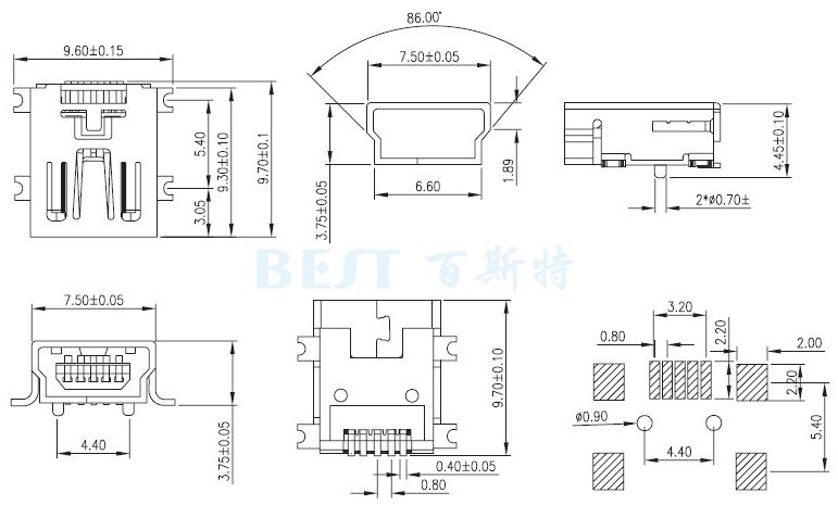 USB插座USB-4T-03貼片180°參考圖紙